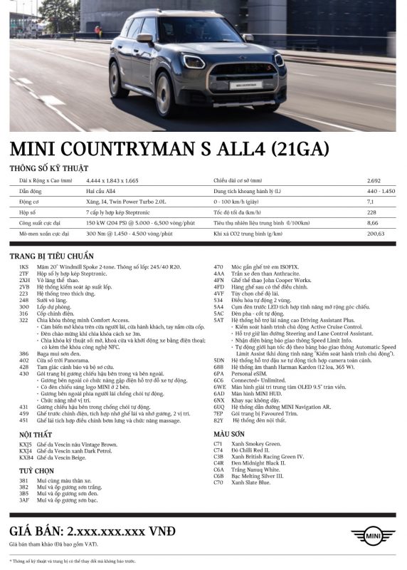 MINI COUNTRYMAN THUẦN ĐIỆN: | 2.989.000.000.000 đ |