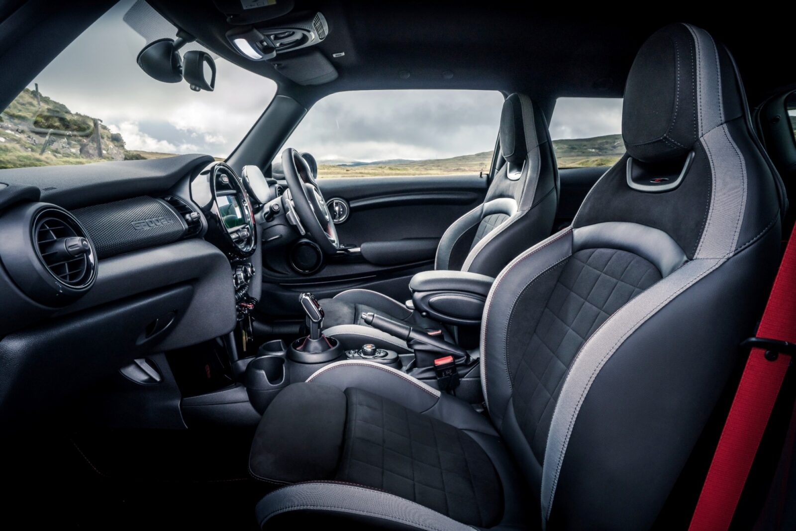 Ghế JCW chất liệu bao gồm Vescin (kiểu da tổng hợp cao cấp) phối với knitted fabrics, có thiết kế kiểu thể thao, ôm người — đặt trọng tâm vào việc giữ tư thế tốt khi vào cua hoặc lái mạnh.